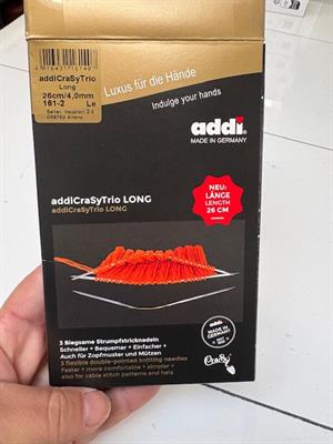 Når der strikkes rundt, fordeles maskerne på to af pindene, og der strikkes med den tredje. Derved er der kun to pindeskift på en omgang. Grundet den fleksible midte ligger pindene godt i enhver hånd og giver dermed en rar strikkeoplevelse. Addi CraSy Trio findes i mange forskellige størrelser.