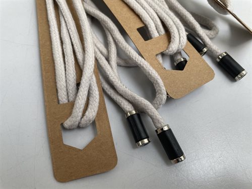 Bomulds anoraksnor i en flot kvalitet, den er rund og fast, med fine metal ender. Lige til at sætte i tøjet