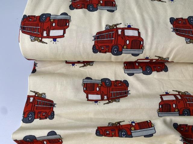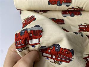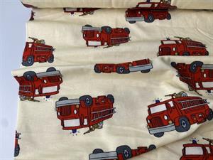 Bomuldsjersey - fine brandbiler på creme bund
