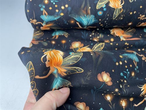Feerne er i blå nuancer med guld vinger, alt sammen på en smuk sort bund