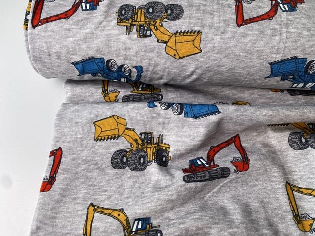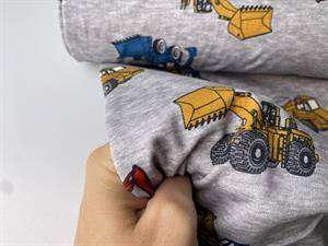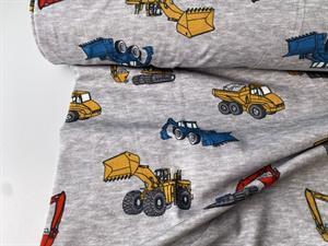 Bomuldsjersey - fine gravemaskiner på gråmeleret bund