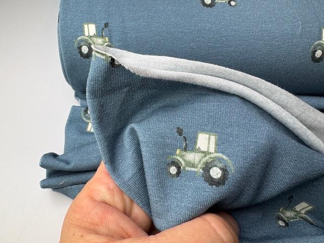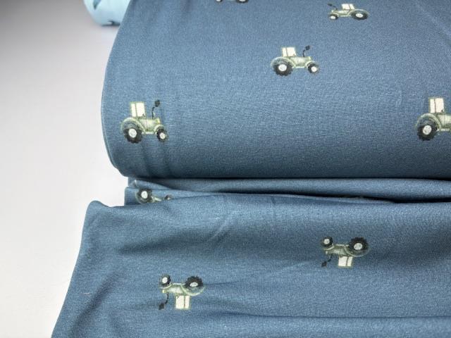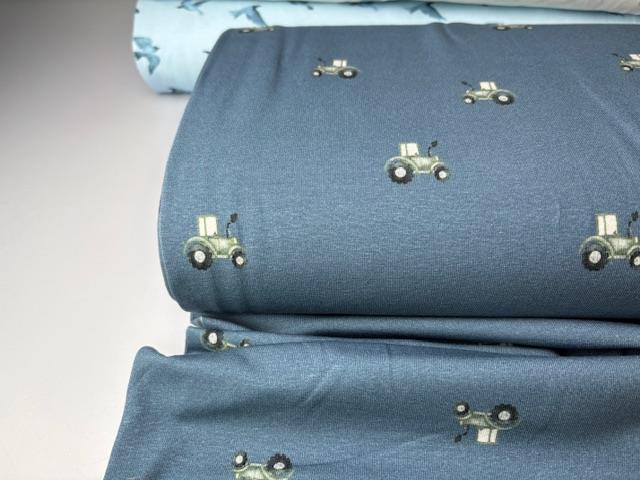 Bomuldsjersey - fine små traktorer på blå bund