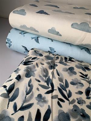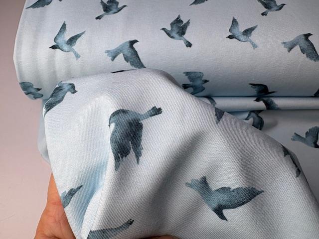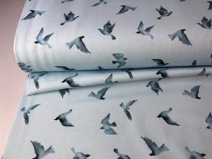 Bomuldsjersey - flotte fugle på lyseblå bund