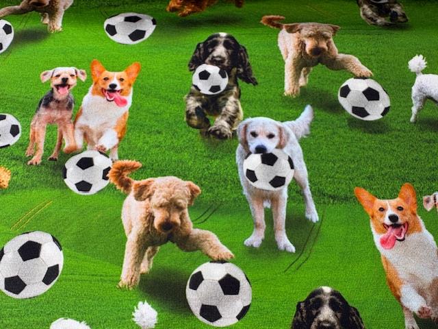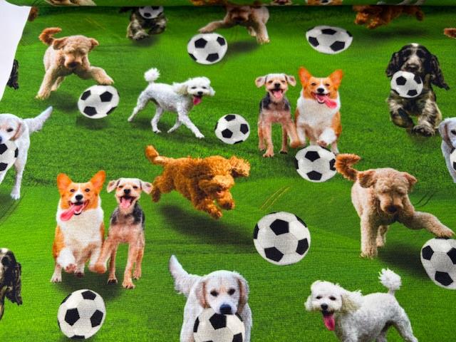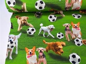 Bomuldsjersey - græsplæne med hunde og fodbolde