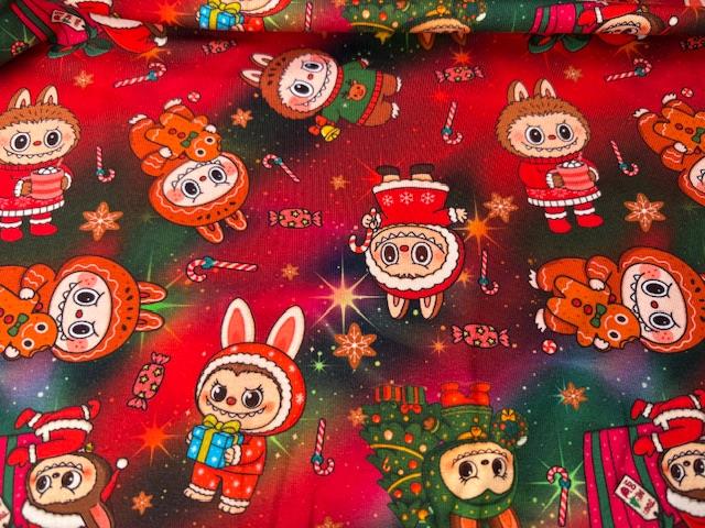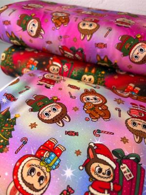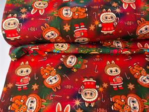 Bomuldsjersey - jule Labubu bamser på rød rainbow bund