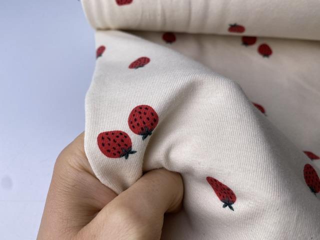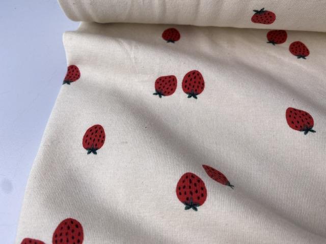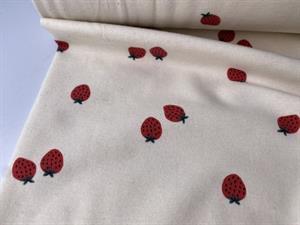 Bomuldsjersey - lækre jordbær på natur bund, gots