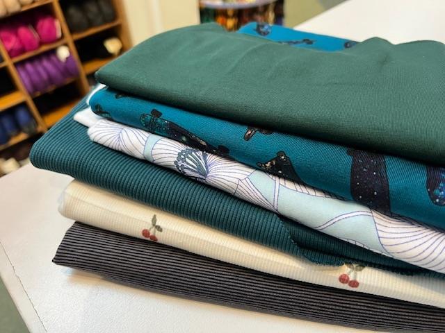 Bomuldsjersey, isoli, fastvævet viscose, hør, poplin, fastvævet bomuld, fleece, gauze og fløjl