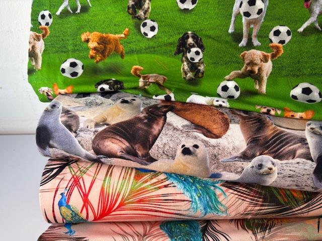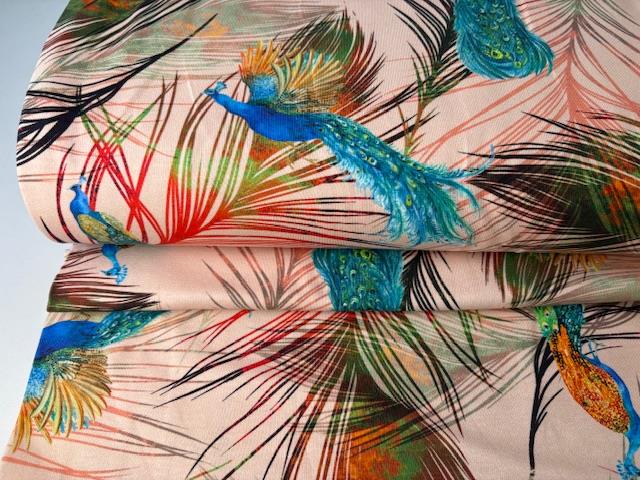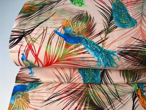 Bomuldsjersey - rosa bund med påfugle på