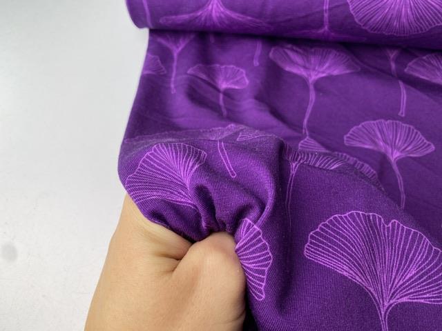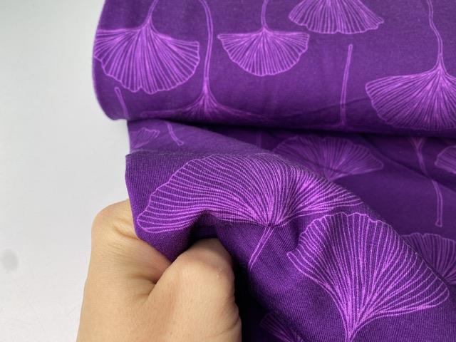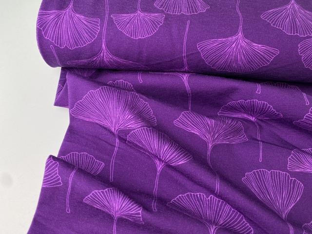 Bomuldsjersey - smukke biloba blade på lilla bund