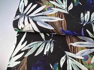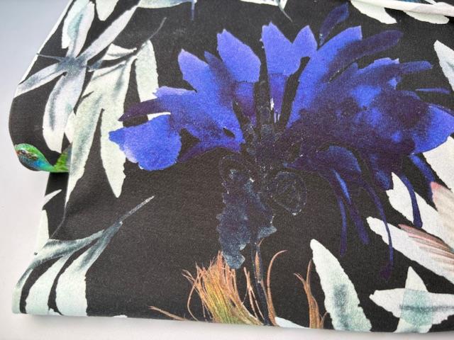 Bomuldsjersey - sort med blå kolibri og blade
