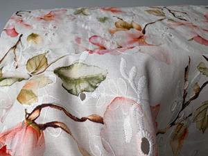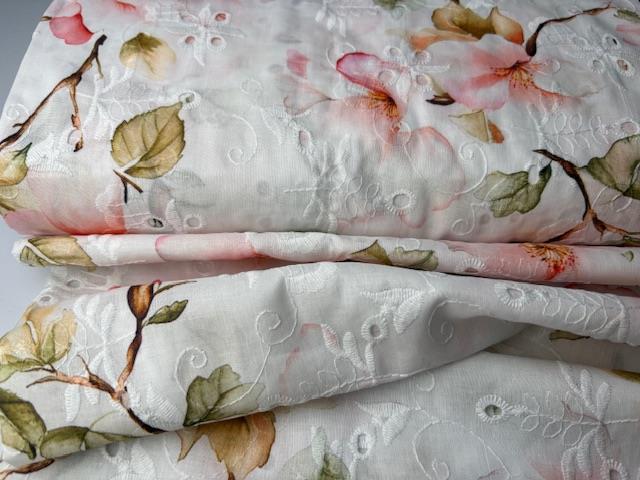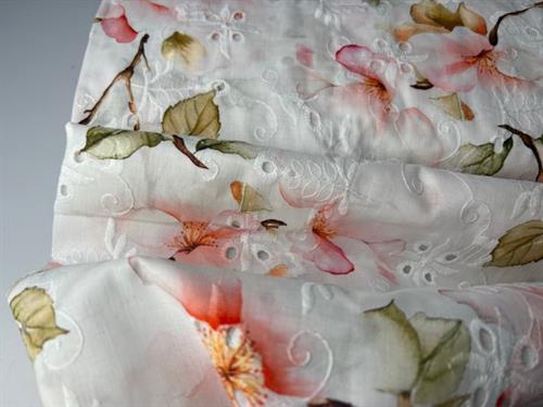 Smuk fastvævet broderi anglaise med flot blomstermotiv i varme farver. Vi drømmer om fine og lette skjorter og sommerkjoler...