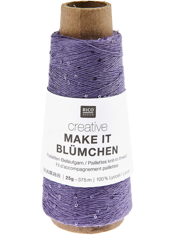 Make It Blümchen fra Rico Design er et flot effektgarn, som kan bruges til kreative projekter. Garnet er et smukt pailletgarn, hvor pailletterne er små og blomsterformede. Garnet består af 100% lyocell og har en løbelængde på 375 meter pr. 25 gram. Det er perfekt som følgetråd i strikke- eller hækleprojekter, hvor det giver et elegant og smukt udseende.