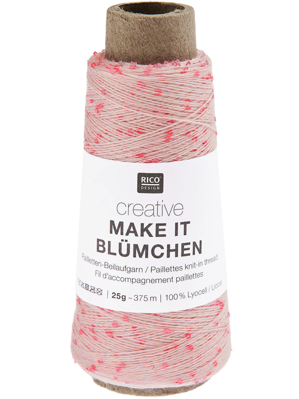 Make It Blümchen fra Rico Design er et flot effektgarn, som kan bruges til kreative projekter. Garnet er et smukt pailletgarn, hvor pailletterne er små og blomsterformede. Garnet består af 100% lyocell og har en løbelængde på 375 meter pr. 25 gram. Det er perfekt som følgetråd i strikke- eller hækleprojekter, hvor det giver et elegant og smukt udseende.