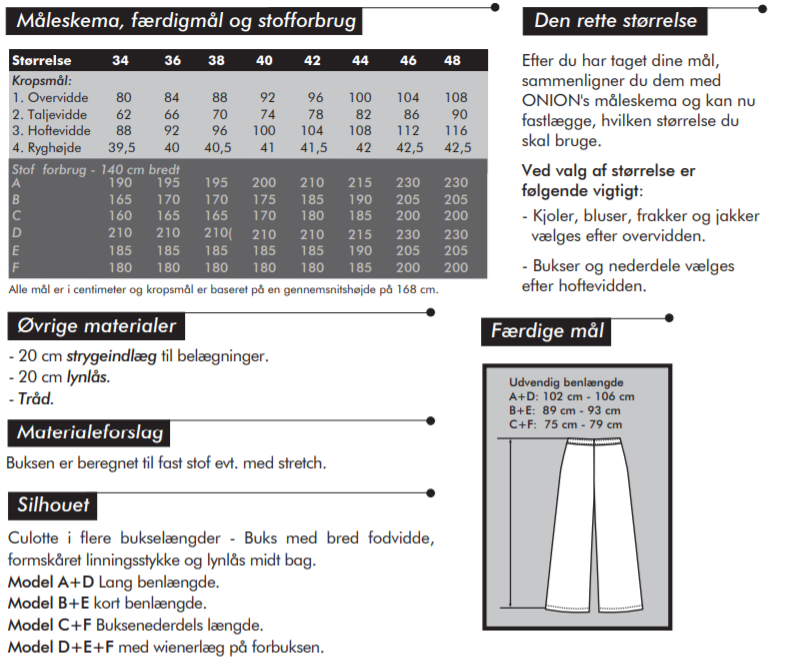 Bukser med megen vidde, kaldet culottes. Modellen kommer her med flere længde-varianter i mønstret + en model med wienerlæg på forbuksen.