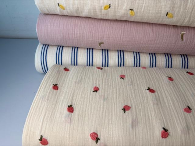 Det korte svar er nærmest alt. De fleste vil nok mene noget til børn eller stofbleer. Men her syr vi kjoler til os selv, shorts i alle størrelser, skjorter til damer eller herrer, løse lette bukser, etage nederdele, sengetæpper, morgenkåber, håndklæder og alt muligt andet. Det er en af vores favoritter.
