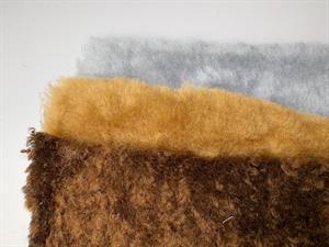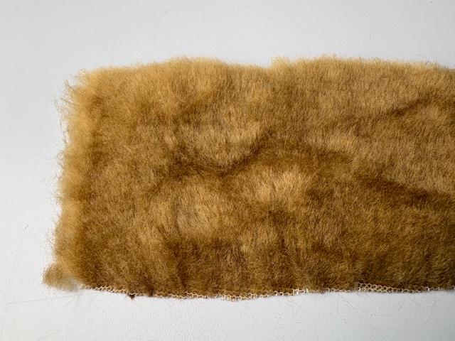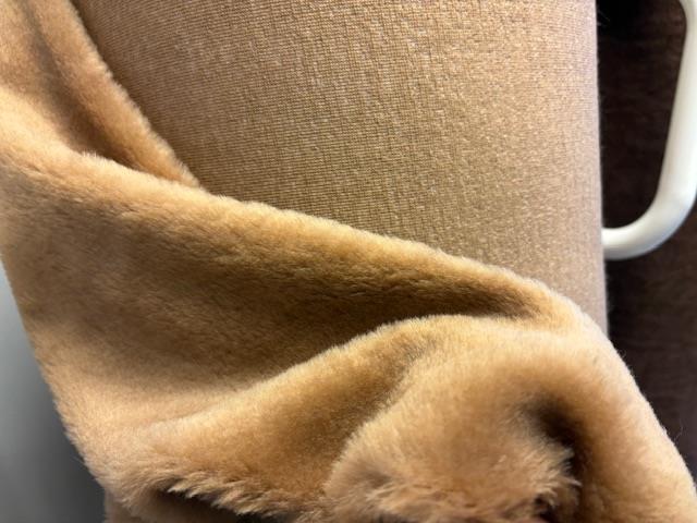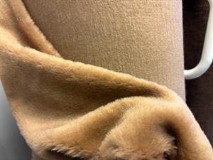 Fake pels i en flot gylden karamel. Den er blød og rar at røre ved. Den er strikket og kan derfor give sig.