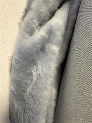 Fake pels i en flot grå. Den er blød og rar at røre ved. Den er strikket og kan derfor give sig.