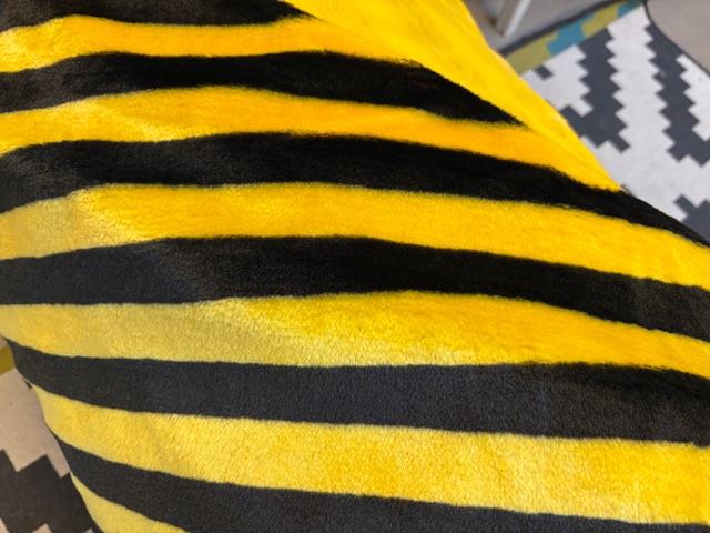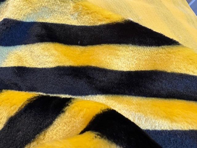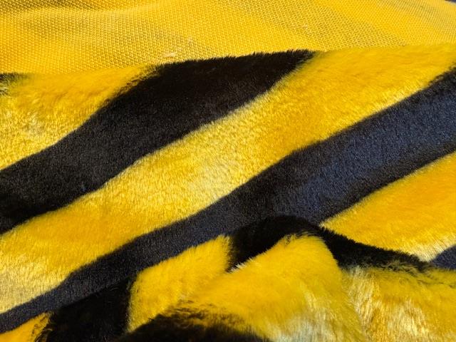 Fake pels i en flot gul og sort. Den er blød og rar at røre ved. Den er strikket og kan derfor give sig.