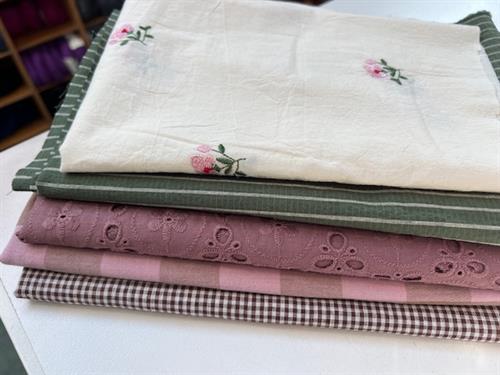 Bomuldsjersey, isoli, fastvævet viscose, hør, poplin, fastvævet bomuld, fleece, gauze og fløjl