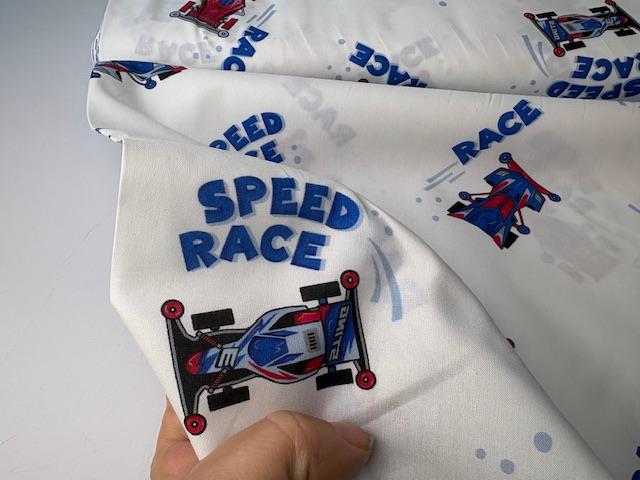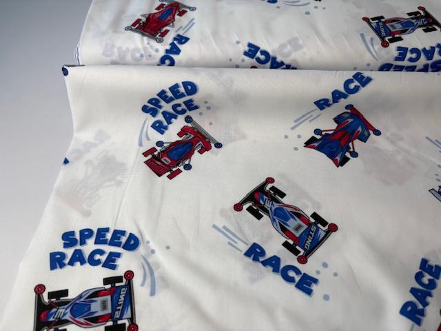 Skøn fastvævet bomuldspoplin i drønlækker kvalitet - her med seje racerbiler.