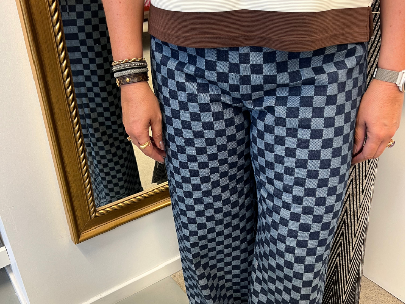 Fastvævet denim med flotte tern i lys og mørk denimblå. Vær opmærksom på, at der er let farveafsmitning fra stoffet. Vi har syet de fedeste bukser efter Tessuti mønster.
