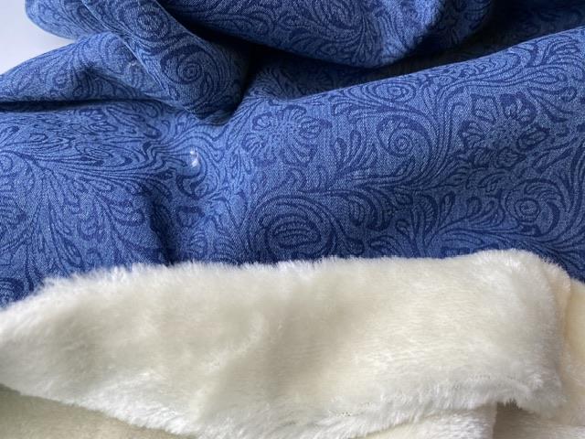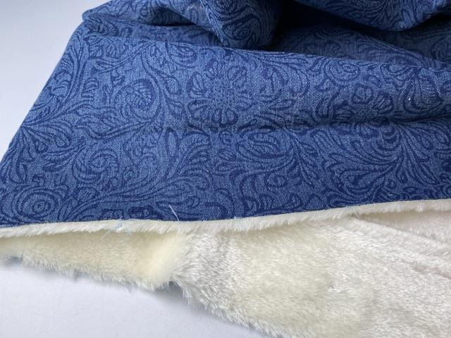 Fastvævet denim med utrolig blød fake fur på vrangsiden. Det er en skøn kvalitet og endda produktionsoverskud. Uh det kunne være fantastisk med en jakke i kvaliteten.