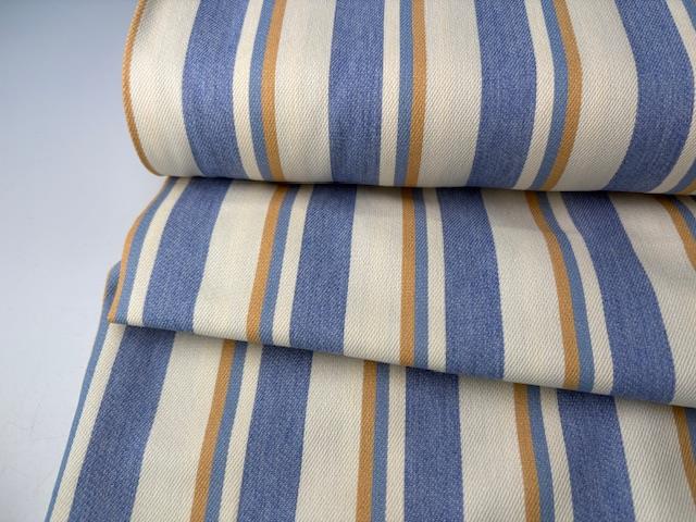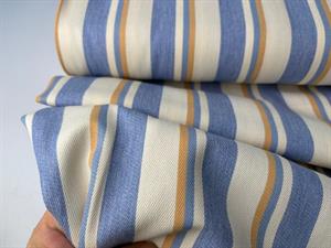 Fastvævet denim - garnfarvede striber i blå, offwhite og camel
