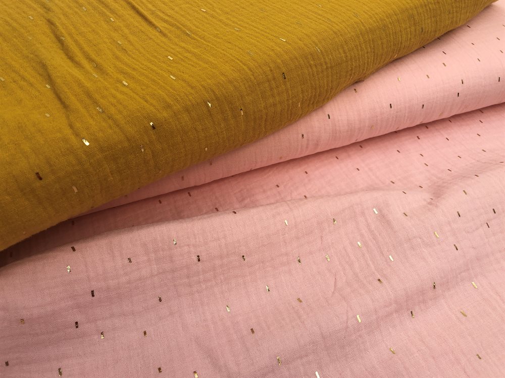 Fastvævet - florlet dobbelt gauze i lyserød ed guld folie streger