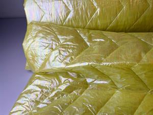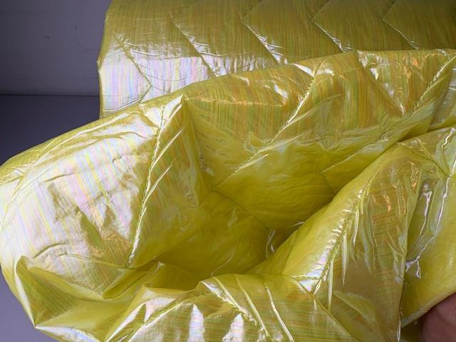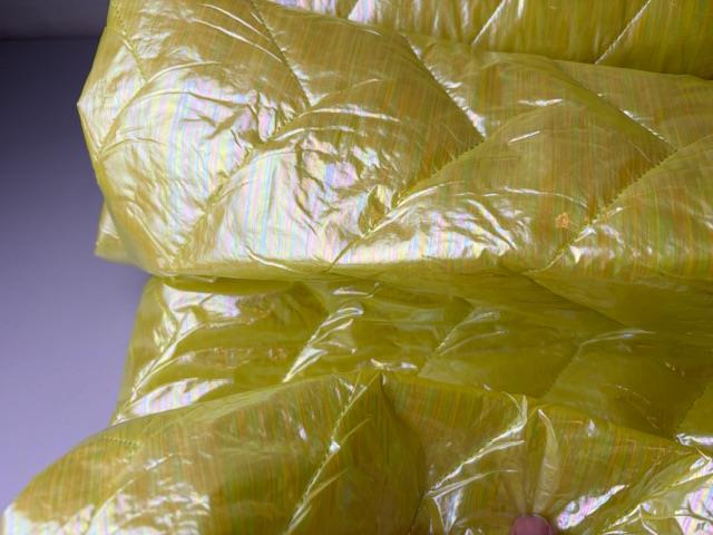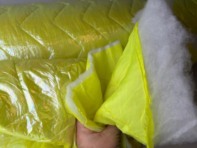 Et quiltet nylonstof i fluorescerende farver med metallisk og perlemorsfinish, fremstillet af 100% polyester og nylon. Super cool til vests, jakker eller korte jakker – til både unge og ældre. Nylonet har en zigzag-syning på tværs af hele stoffets bredde, hvilket betyder, at det ikke længere er vandtæt. Blødt vat bruges som fyld mellem lagene af nylon. Stoffet er bæredygtigt produceret i henhold til OEKO-TEX Standard 100. Det er 135–138 cm bredt og vejer 165 g/m².