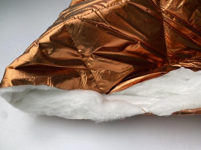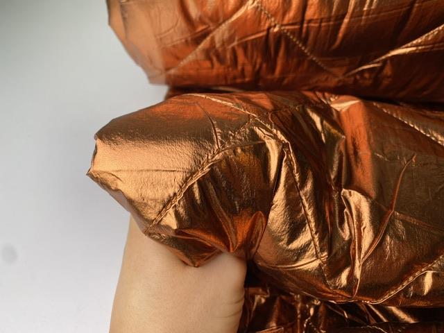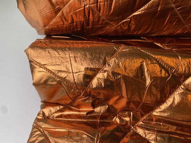 Dette quiltede stof med et metallisk look er lavet af 98% polyester og 2% polyurethan. Det er OEKO-TEX STANDARD 100-certificeret og lever op til høje krav til sikkerhed og bæredygtighed. Stoffet vejer 335 g/m² og er 137–140 cm bredt. Perfekt til en jakke!