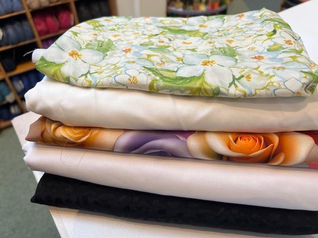 Bomuldsjersey, isoli, fastvævet viscose, hør, poplin, fastvævet bomuld, fleece, gauze og fløjl