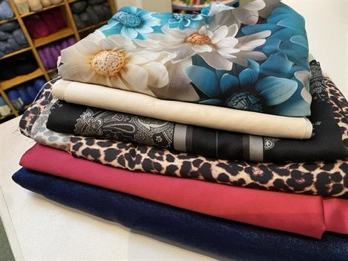 Bomuldsjersey, isoli, fastvævet viscose, hør, poplin, fastvævet bomuld, fleece, gauze og fløjl