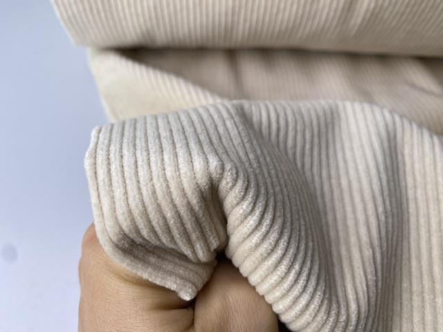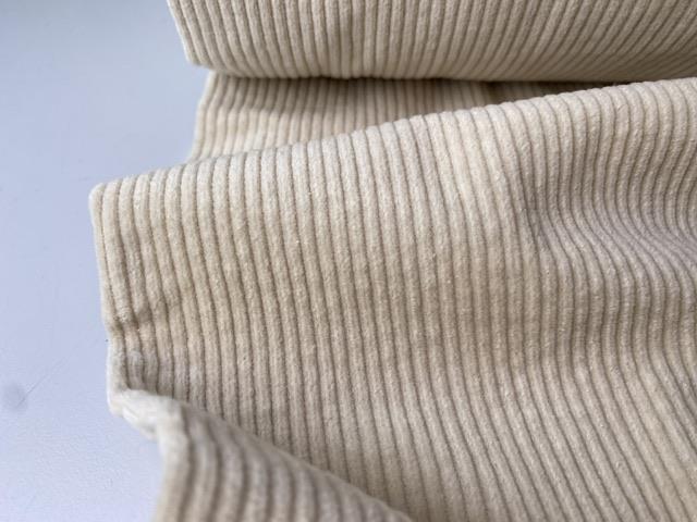 Fløjl / bubble corduroy i en lækker creme med stræk. Det er en skøn kvalitet og super fin farve. Denne 8-wales fløjl er et vævet stof lavet af bomuld og elastan. Komfortstrækket bidrager til den fine bobleeffekt. Dette stof er i øjeblikket meget udbredt til jakker og bukser.