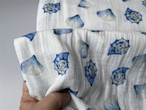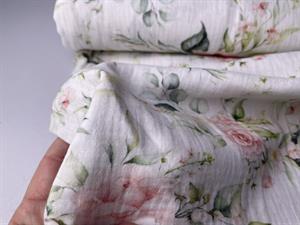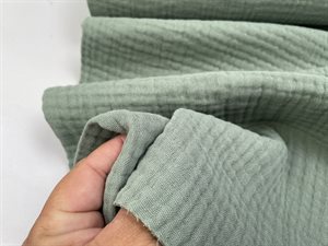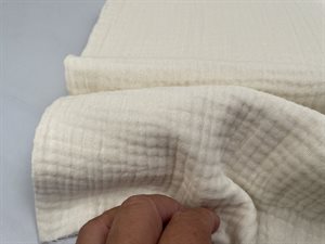 • Struktur: Dette stof er dobbeltvævet, hvilket betyder, at to lag af gauze stof er blevet vævet sammen. Resultatet er et stof, der stadig er let og åndbart, men med en forbedret blødhed og styrke sammenlignet med enkeltlaget gauze.