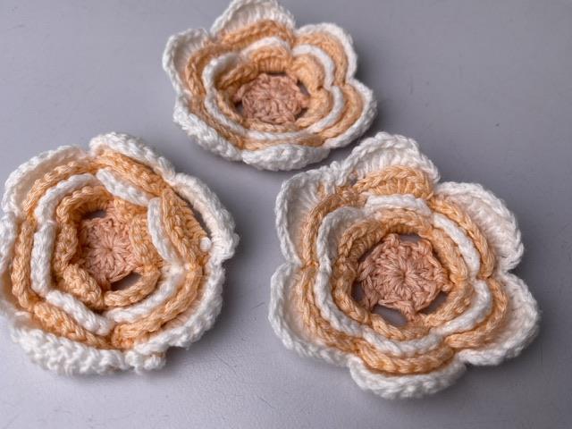 Hæklet blomst i fersken og hvid. Når du køber 1 pakke, får du 3 stk.