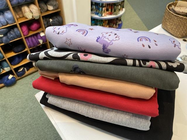 Bomuldsjersey, isoli, fastvævet viscose, hør, poplin, fastvævet bomuld, fleece, gauze og fløjl