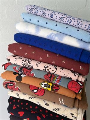 Bomuldsjersey, isoli, fastvævet viscose, hør, poplin, fastvævet bomuld, fleece, gauze og fløjl