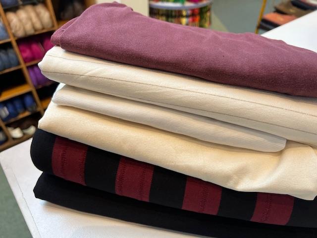Bomuldsjersey, isoli, fastvævet viscose, hør, poplin, fastvævet bomuld, fleece, gauze og fløjl