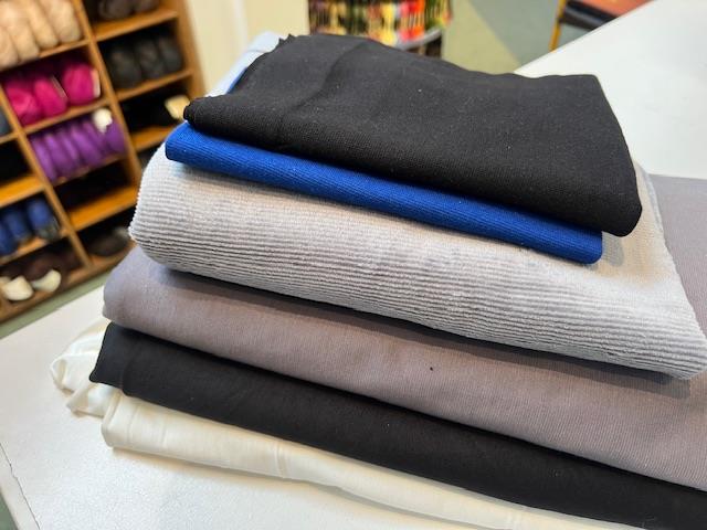 Bomuldsjersey, isoli, fastvævet viscose, hør, poplin, fastvævet bomuld, fleece, gauze og fløjl