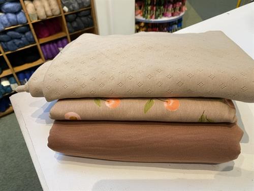 Bomuldsjersey, isoli, fastvævet viscose, hør, poplin, fastvævet bomuld, fleece, gauze og fløjl