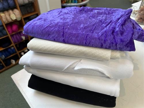 Bomuldsjersey, isoli, fastvævet viscose, hør, poplin, fastvævet bomuld, fleece, gauze og fløjl