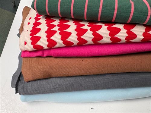 Bomuldsjersey, isoli, fastvævet viscose, hør, poplin, fastvævet bomuld, fleece, gauze og fløjl