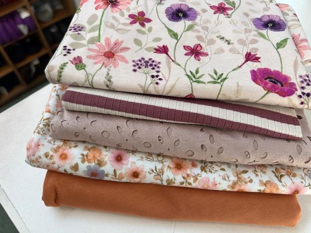 Bomuldsjersey, isoli, fastvævet viscose, hør, poplin, fastvævet bomuld, fleece, gauze og fløjl