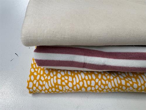 Bomuldsjersey, isoli, fastvævet viscose, hør, poplin, fastvævet bomuld, fleece, gauze og fløjl