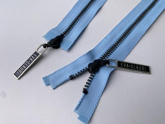 Lynlås - 2-vejs, lyseblå med sorte metaltænder, 50 cm