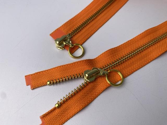 Lynlås - 2-vejs, orange med guld metaltænder, 48 cm