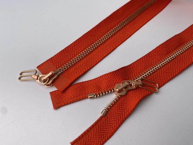 Lynlås - 2-vejs, orangerød med rose gold metaltænder, 42 cm