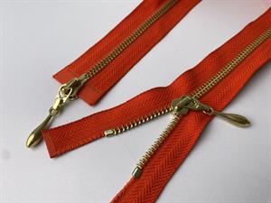 Lynlås - 2-vejs, orangerød med guld metaltænder, 42 cm