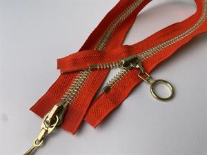 Lynlås - 2-vejs, orangerød med grove guld plasttænder, 42 cm