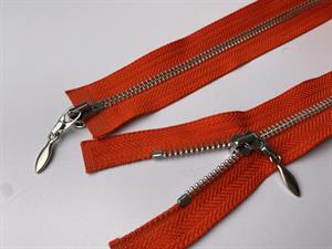 Lynlås - 2-vejs, orangerød med sølv metaltænder, 42 cm